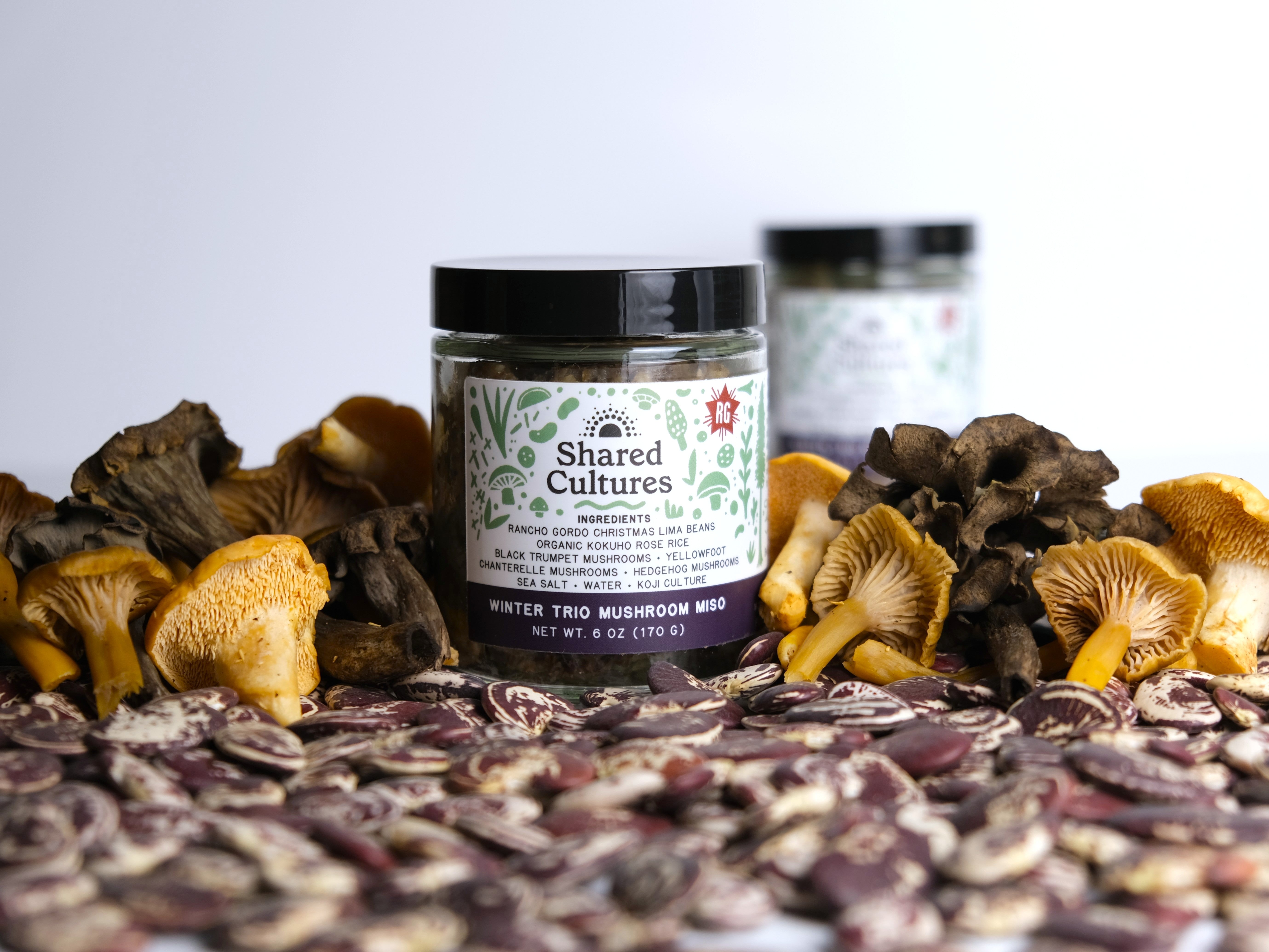 This special mushroom miso honors the Winter Trio of wild-foraged mushrooms native to Northern California—black trumpets, hedgehogs, and yellowfoot chanterelle mushrooms. These prized, edible mushrooms appear around the same time of year, share space in similar coastal forest habitats, and are often foraged and enjoyed together.