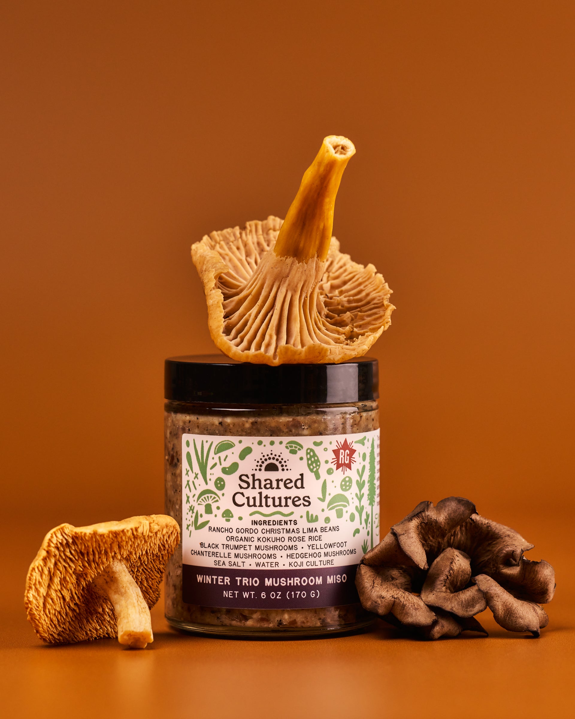 This special mushroom miso honors the Winter Trio of wild-foraged mushrooms native to Northern California—black trumpets, hedgehogs, and yellowfoot chanterelle mushrooms. These prized, edible mushrooms appear around the same time of year, share space in similar coastal forest habitats, and are often foraged and enjoyed together.