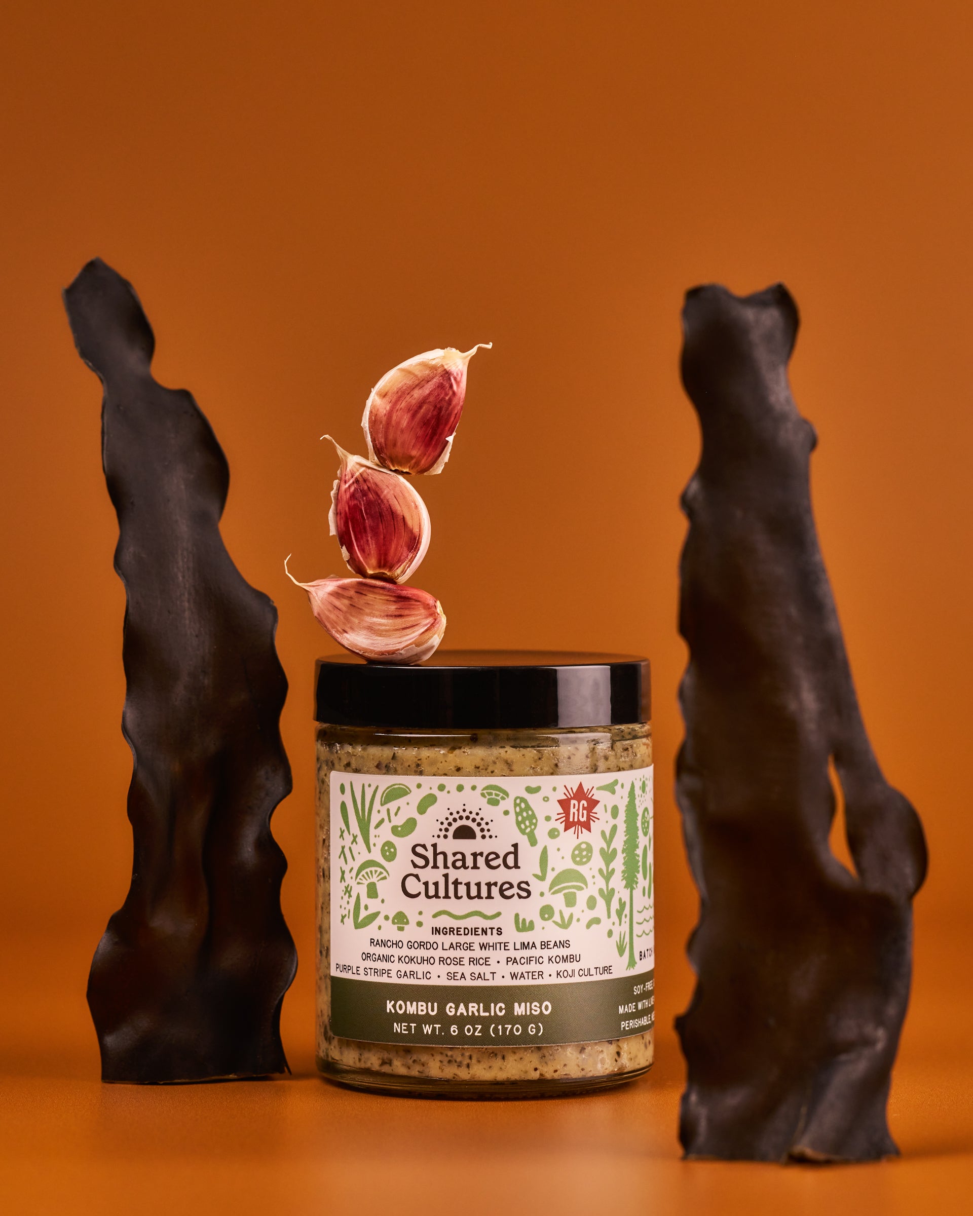 Pacific Ocean kombu seaweed and purple stripe garlic from Burlap & Barrel are fermented with San Francisco grown koji, organic heirloom rice from Koda Farms, and Rancho Gordo large white lima beans to create a miso reminiscent of the California coast.
