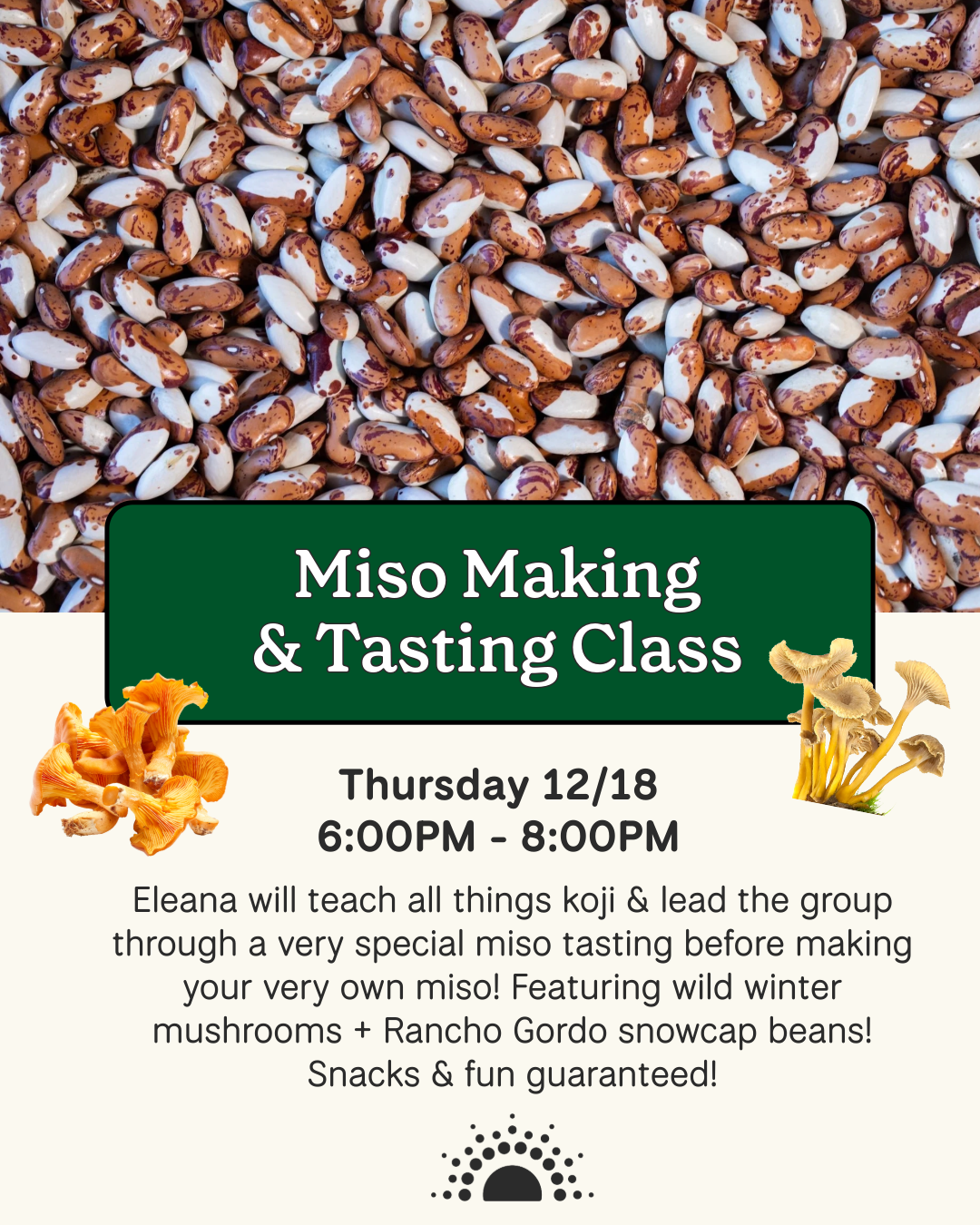 This is a hands-on, 2-hour workshop. In the first half, we will learn and explore koji—its history, how its made, and its role in food preservation—while tasting a variety of our misos. In the second half of the workshop, we will ferment miso together, and each participant will take home a quart-sized jar (~1lb) of miso along with the knowledge to continue fermenting at home. Expect flavor surprises, a little mess, and a lot of fun.